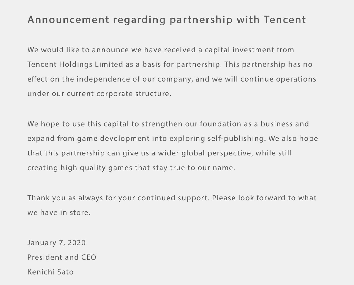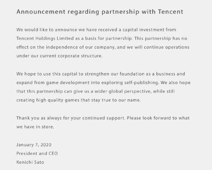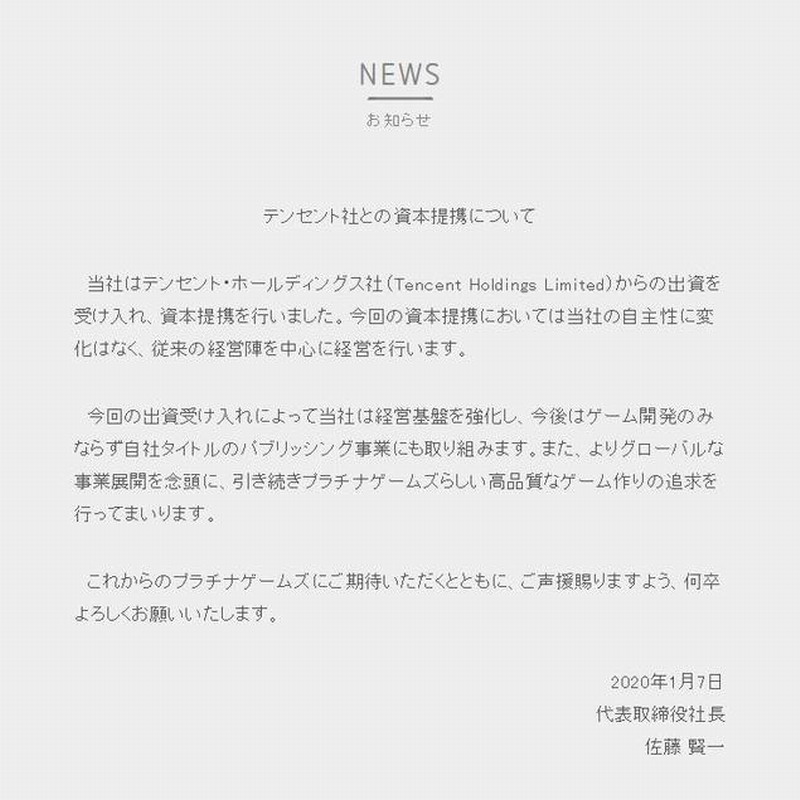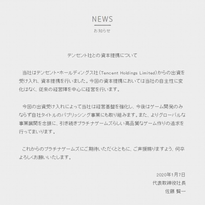 之前白金工作室曾宣布将在新年伊始发布若干个大新闻,今日(1月7日)白金工作室官方宣布与腾讯达成合作关系。CEO佐藤贤一称白金工作室已获得腾讯控股有限公司的资本投资,他强调腾讯的投资不会影响白金工作室的独立性,白金工作室依旧会在当前公司架构和管理团队下继续运营。