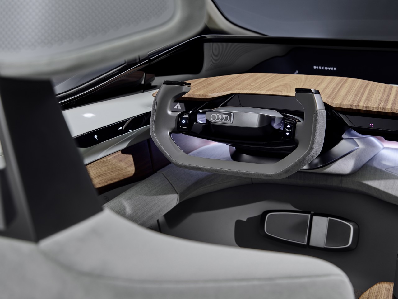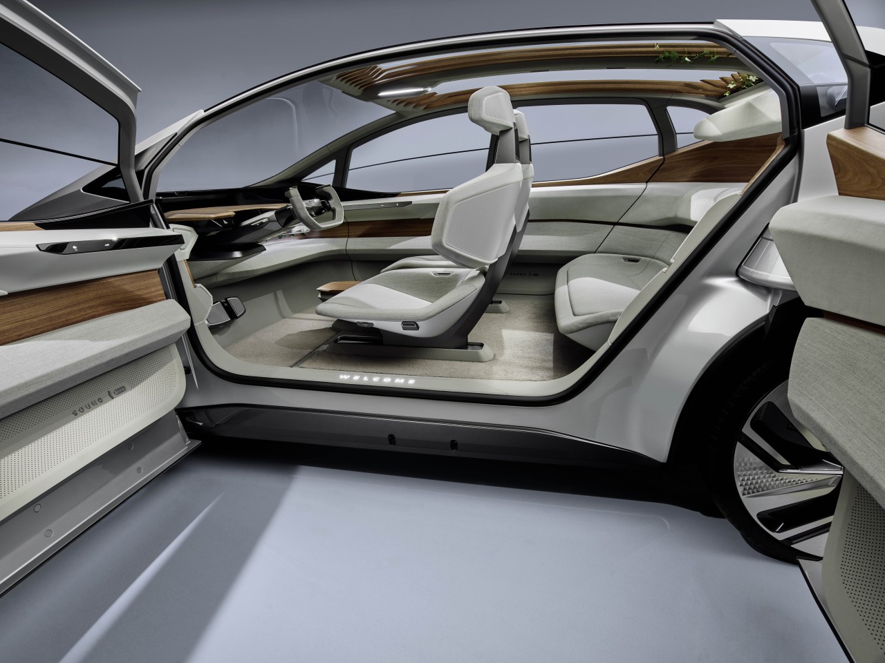 内部简约而美观,米色的织物和木头材料的突显让人有一种置身于超现代休息室的感觉。手动控制方案极为简单,另配有半个方向盘、一个启动按钮、档位选择器、加速器、刹车踏板。当不开车的时候,方向盘还能折叠起来变成一个木制的小托盘,这样驾驶者就可以在上面放置笔记本等其他东西。