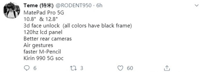 1月4日消息,近日国外知名爆料人Teme曝光了一组华为MatePad Pro 5G版的配置信息。信息显示,华为这款全新的5G平板产品将提供10.8英寸及12.8英寸两个版本,屏幕为120Hz的LCD屏,支持3D人脸识别与隔空手势操作。
