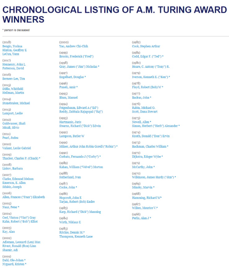 图灵奖有“计算机界诺贝尔奖”之称,虽然不是家喻户晓,但是他们的创新已经改变了我们的生活。Tim Berners-Lee(2016年图灵奖获得者)发明了万维网和第一个网络浏览器。Whitfield Diffie和Martin Hellman(2015年图灵奖获奖者)发明了公共密钥加密技术,这种安全技术使我们能够放心地在线输入信用卡号。Raj Reddy(1994)开创了人工智能的先河,该技术使计算机能够理解自然语言。Yoshua Bengio、Geoffrey Hinton和Yann LeCun(2018年图灵奖获得者)在深度学习方面的突破实现了自动驾驶汽车,面部识别等功能。
