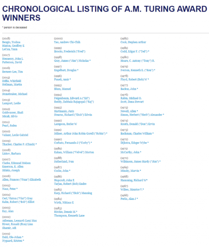 2019年图灵奖的提名应于1月15日由计算机科学协会(ACM,该奖项授予组织)进行。ACM通常在3月宣布获奖者。6月下旬,它将在旧金山举行的颁奖晚宴上向获奖者以及其他不太知名的计算机奖的获奖者致敬。如果你参加颁奖晚宴,会发现一个明显的现象:几乎所有获得计算机最高奖项的人都是男性。