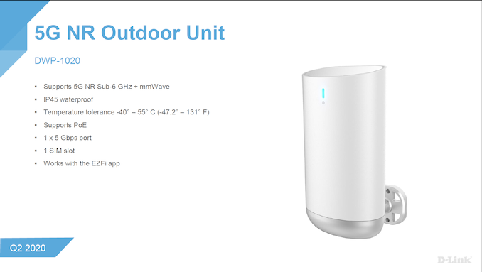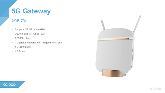在2020年国际消费电子展(CES 2020)上,D-Link发布DWR-2010 5G NR增强型网关,现在支持6 GHz以下频段的5G,同时在另一端供AX3000级Wi-Fi连接。主要规格包括下行速度高达4 Gbps(5G)/2 Gbps(4G LTE+)、3x1Gb和1x2.5Gb LAN端口、1Gbps WAN端口、1个USB 3.0端口、一个SIM卡插槽和一个语音服务RJ-11端口。