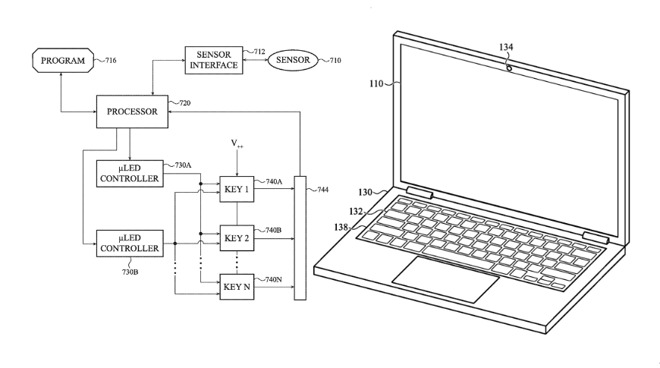 苹果在美国专利10528152中写道:“虽然一些传统键盘可能包括按键的内部照明,但这种传统键盘通常无法单独动态控制每个按键的照明方案,如颜色或色调。为了提供更好的用户体验,并增加反馈给用户的信息,需要单独动态控制每个按键的照明。“