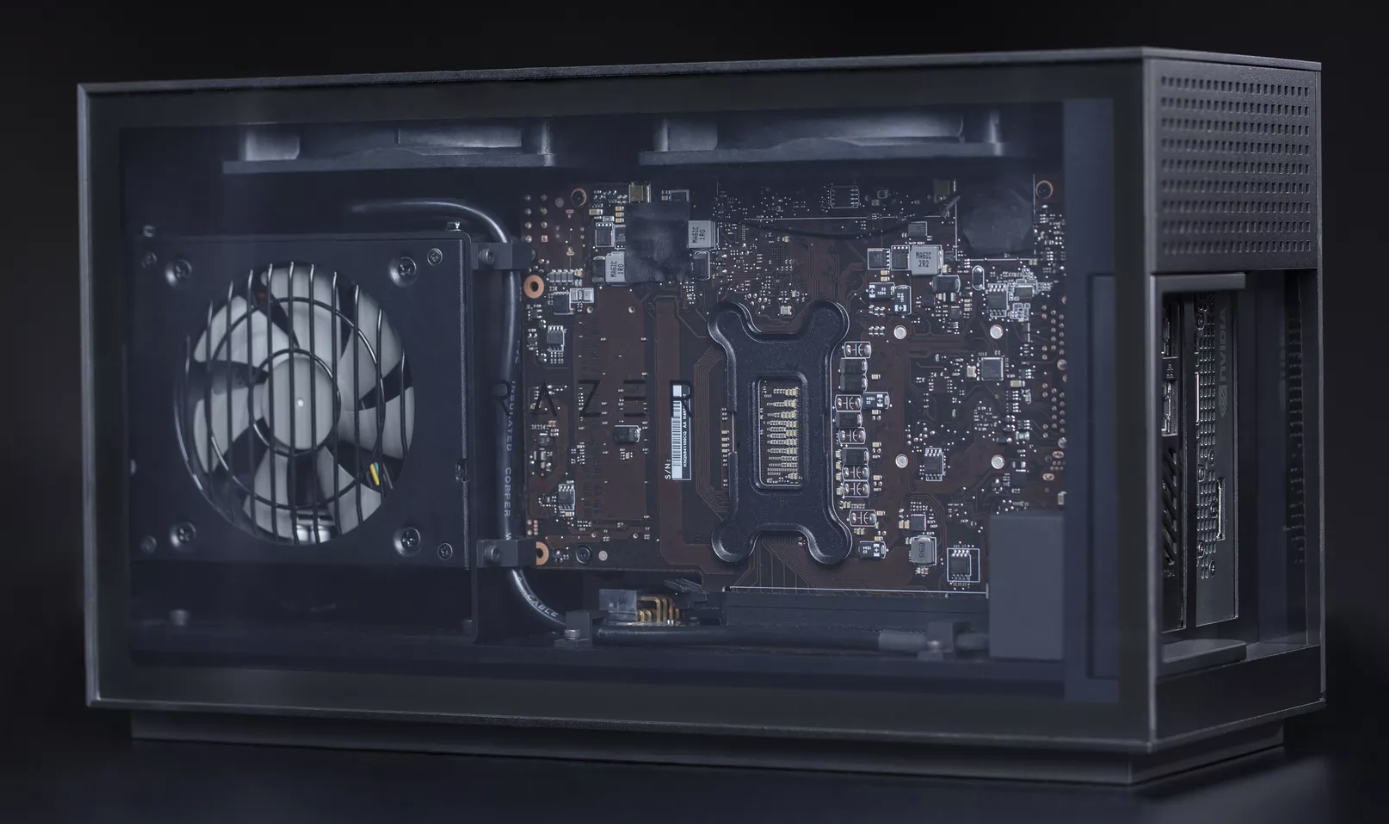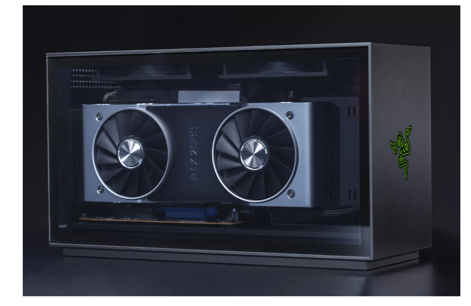 乍一看似乎Razer Tomahawk只是一个外部GPU显卡盒,采用光滑的铝制和钢化玻璃盒,里面没有传统的主板或台式机CPU,而是一台Intel NUC Element模块化电脑,其中包含高达45W的Core i9-9980HK移动CPU,散热风扇,内存和存储插槽,Wi-Fi 6无线网卡,大量端口以及主板通常需要为的供电接头。