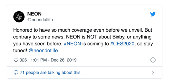 又到了一年一度的CES。在外界吐槽CES变为“车展”“电视展销会”之余,每年我们还是会看到一些让人眼前一亮的产品。今年,背靠三星的NEON,就是那个值得关注的项目。从去年年底,三星的人工智能项目NEON就在社交媒体上开始了预热,坊间也有“仿生人”“人造人”之类的各种猜测。