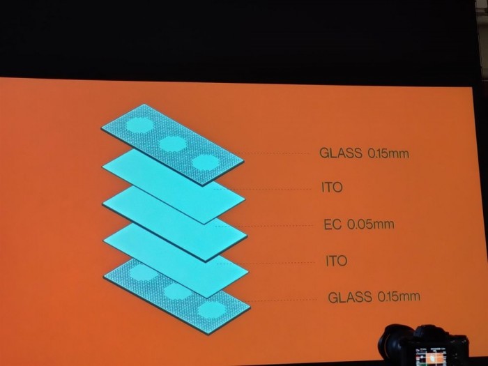 ▲ OnePlus Concept One上的电致变色玻璃解决方案概述。有两块0.15毫米玻璃,一块0.05毫米电致变色材料和两块氧化铟锡(ITO)涂层。 ITO涂层使玻璃表面具有导电性。