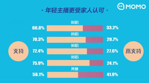 主播关于职业认可度的数据与观众相吻合,69%的主播得到了家人和伴侣的支持,74.2%的女性主播得到了家人或伴侣的支持,82.8%的职业主播获得了家人或伴侣的支持,兼职主播获得家人或伴侣支持的占比为62.7%。年纪越轻,家人及伴侣认可程度越高。80后主播获得家人及伴侣支持的仅为66.8%,85后这一比例为70.3%,90后为72.4%,95后高达75.9%。