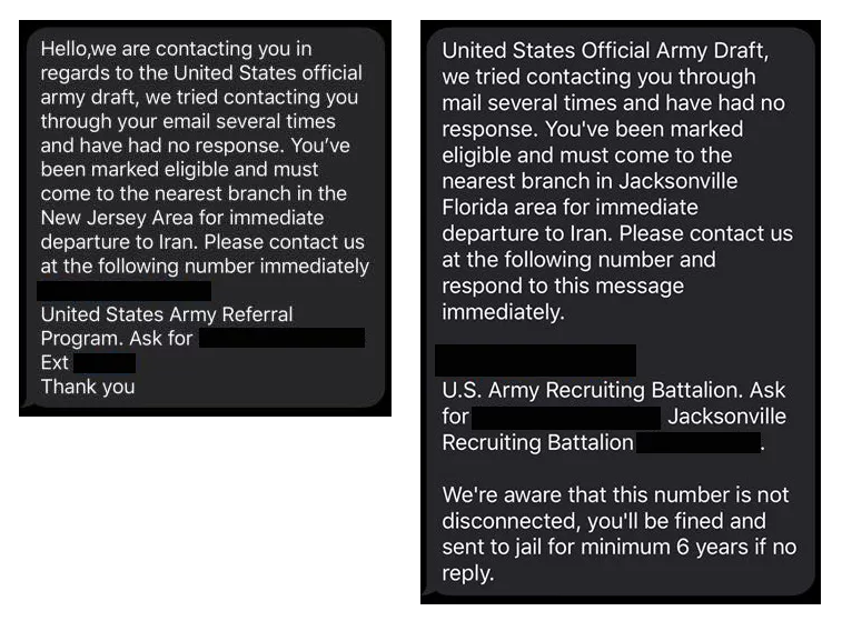 据外媒The Verge报道,当地时间周二美国军方发布了一条新闻公告,警告公众注意来自自称是征兵人员的欺诈性短信。一些短信内容声称,接收消息的人可以前往他们的当地招募办公室以“立即启程前往伊朗”。另一些短信则对该信息进行了扩展,声称如果该人不回应,他们将“被罚款并可能至少被判入狱6年”。
