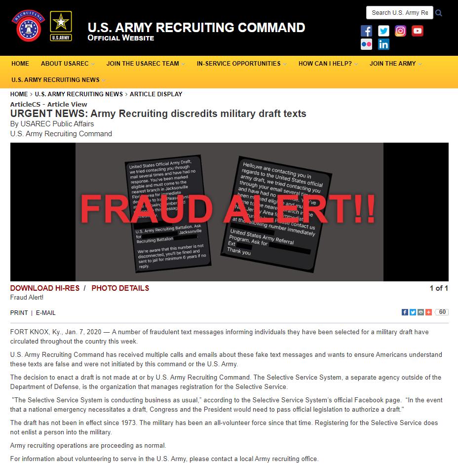公告指出:“美国陆军征兵司令部收到了关于这些虚假短信的多次电话和电子邮件,并希望确保美国人理解这些文字是虚假的,并且不是由该司令部或美军发出的。”陆军在公告中表示,国会和总统必须先批准一项草案,然后才能进行征兵。