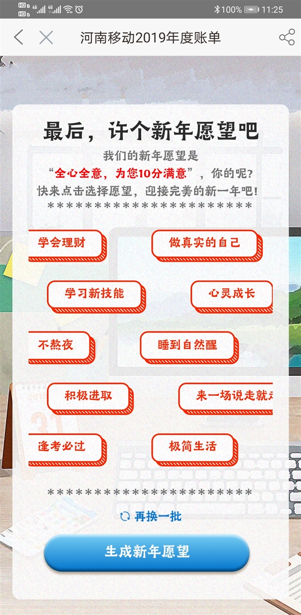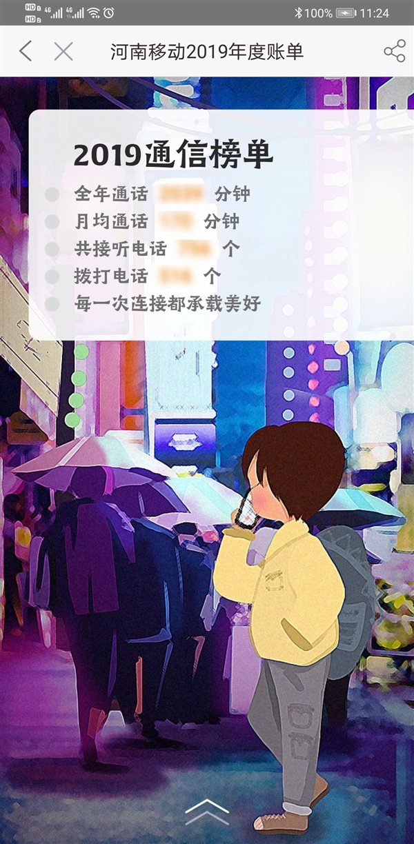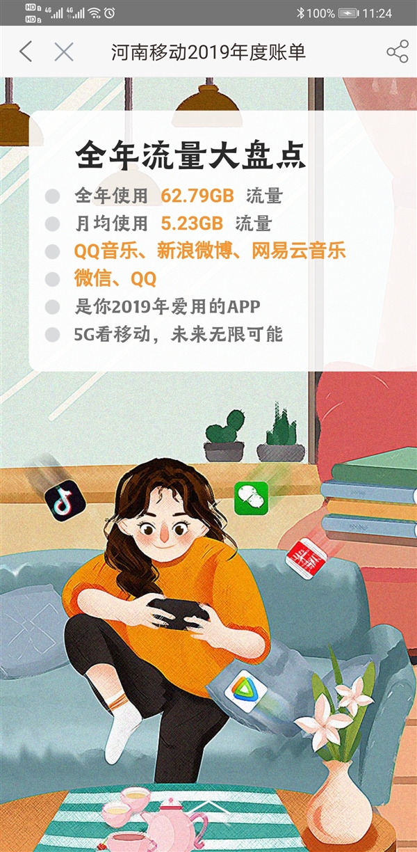 此外,还能查看你2019的通话信息,包括全年通话分钟、月均通话分钟、共接听电话个数、拨打电话个数等。不仅如此,此次账单还提供了你全年的使用流量详情,包括全年使用的总流量、月均使用流量。以及你2019年最爱用的APP,笔者去年最常用的是QQ音乐、新浪微博、网易云音乐、微信以及QQ。