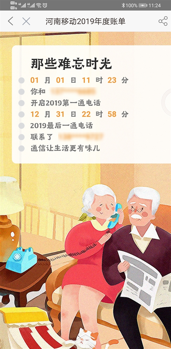 账单还记录了2019年第一通电话以及2019年最后一通电话,满满回忆。