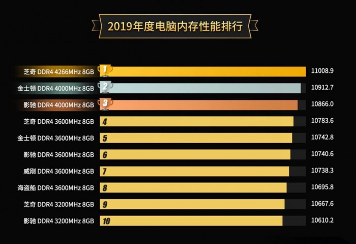 金士顿DDR4 4000MHz 8GB、影史DDR4 400MHz 8GB紧随其后,位列二、三位。上榜前十的还有:芝奇DDR4 3600MHz 8GB、金士顿DDR4 3600MHz 8GB、影驰DDR4 3600MHz 8GB、威刚DDR4 3600MHz 8GB、海盗船DDR4 3600MHz 8GB、芝奇DDR4 3200MHz 8GB、影驰DDR4 3200MHz 8GB。