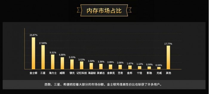 市场占比方面,金士顿以28.7%的份额排名第一,第二、第三分别是是三星(17.8%)、海力士(9.31%)。