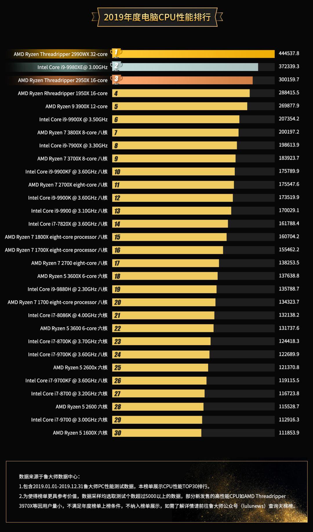 这颗32核心的怪兽均分超过44万,比第二名的Intel Core i9-9980XE足足要高出7万分,成为鲁大师年度最强CPU。