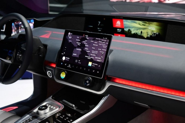 这8个屏幕包括两个侧视镜屏幕、一个以安全的视线水平显示导航信息的前显示屏、一个集成到内部设计中的仪表板显示屏(可以巧妙地提供视觉警报和通知)、一个可以访问各种汽车功能的中央控制台显示屏,一个用户显示车辆主要界面的中央信息屏幕,以及两个物理旋钮,每个都有自己的显示屏,总共有八个。