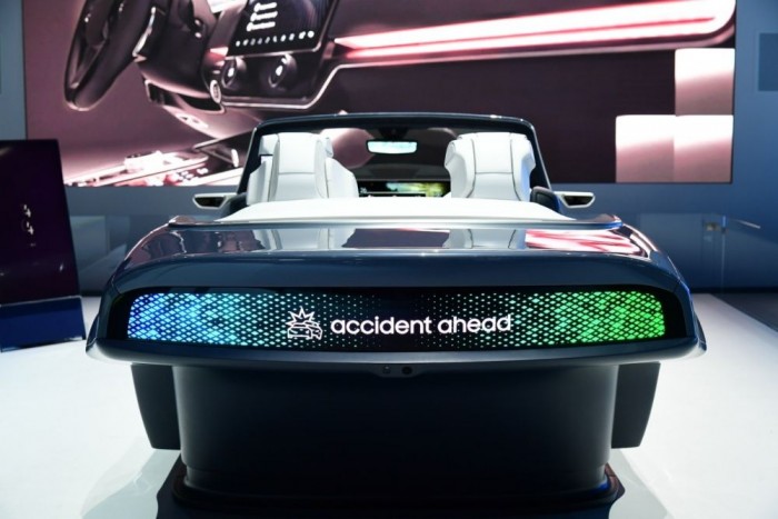 在三星的设想中,未来汽车驾驶舱会有8个屏幕,此外还有三个没有连接到驾驶舱的屏幕。其中两个主要为后排乘客提供娱乐服务,而最后一个屏幕则最为有趣,是一款53.7英寸的MicrOLED尾灯显示屏,可用于向车内外的人显示消息和警告。
