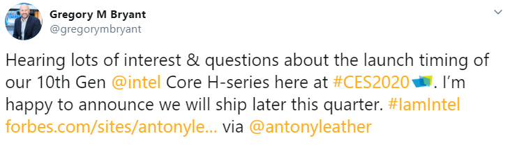 Intel在本届CES上带来了10代酷睿Comet Lake-H,即笔记本平台标压高性能处理器。然而,对于具体的SKU型号和规格参数,Intel仍旧三缄其口,甚至连上市时间都没提。可能是被问烦了,Intel客户端事业部执行副总裁Gregory Bryant在个人社交平台确认,10代酷睿标压处理器将于一季度晚些时候出货,也就是3月份了。