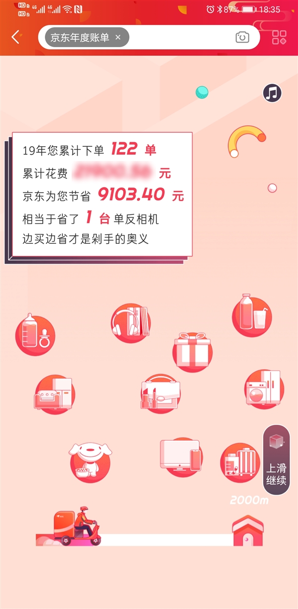 当然,全年的累计单数、消费金额必不可少。笔者是京东的老用户,2019年累计下单122单。除了总消费之外,在年度账单中,京东还会列出来为你省去的钱。