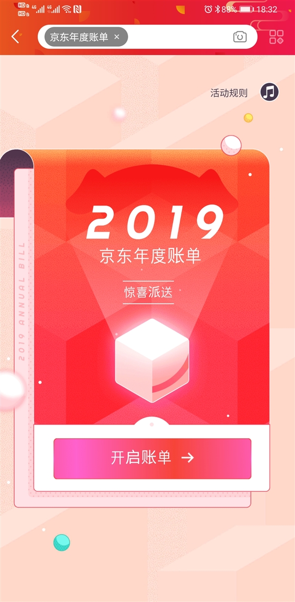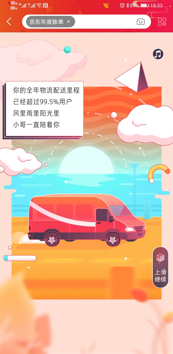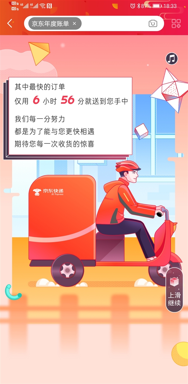 2020年第一周,“年度账单”成为关键词。支付宝之后,京东也发布了2019年度账单。在京东搜索“年度账单”即可查看。进入年度账单之后,可以看到过去一年收到的包裹数量,还有你的物流配送里程已经超过xxx的用户,以及最快的订单在x小时x分送到你的手中。