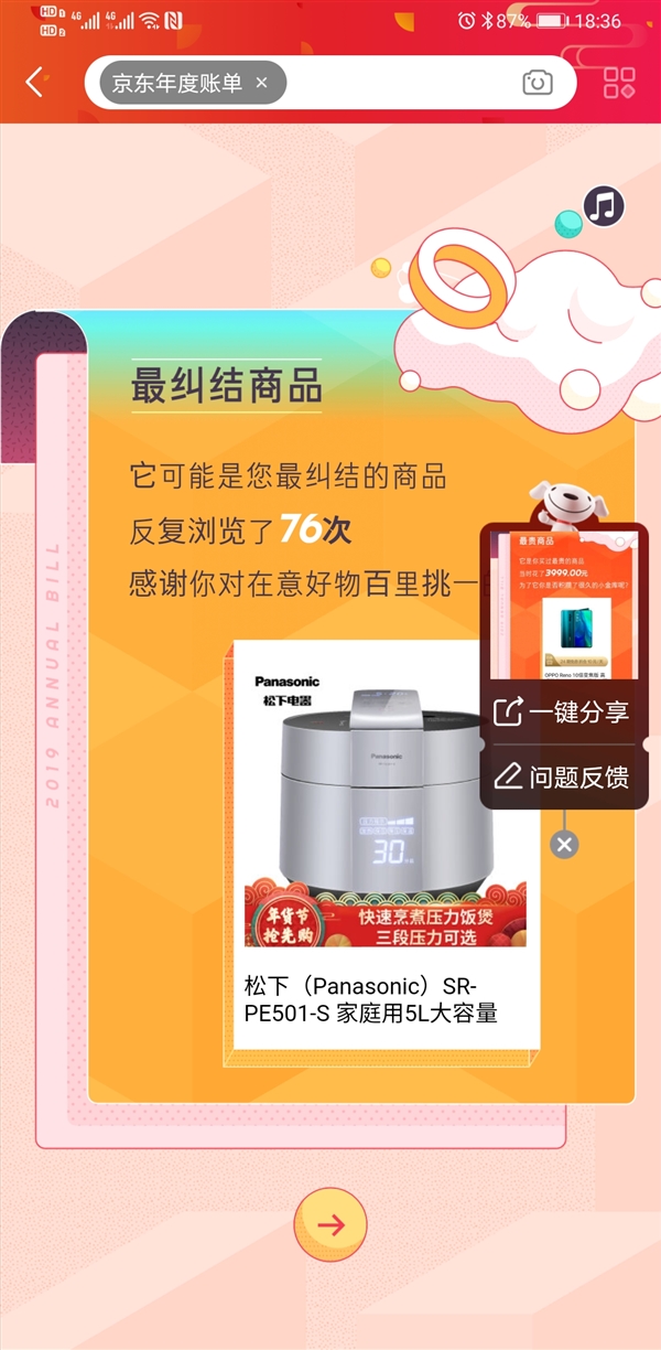 有意思的,京东还会统计你过去一年最纠结的产品。笔者过去一年最纠结的是一款松下SR-PE501-S 5L压力饭煲,足足看了76次才下手,看完吓一跳。