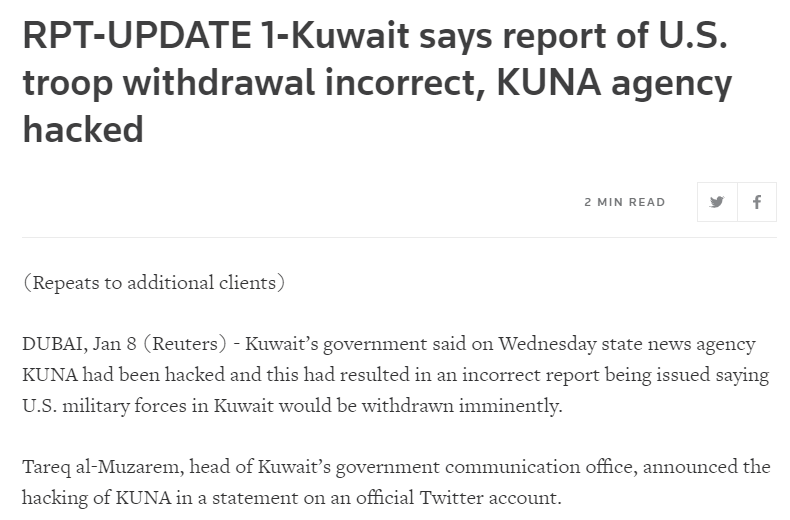 据外媒The Verge报道,科威特国家新闻社(KUNA)周三表示,其Twitter帐户遭到黑客攻击,并被用来散布有关美军撤出该国的虚假信息。据路透社报道,现已删除的报告指出,科威特国防部长已收到美国的一封信,信中称驻科威特美军将在三天内离开该国。