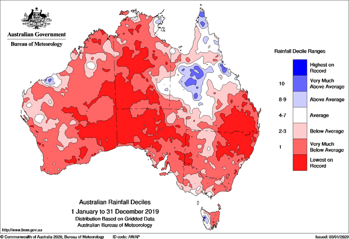 伴随着创纪录的高温天气,澳大利亚还迎来了创纪录的低降水量,这个国家的大部分地区都在遭受着严重的干旱问题。据悉,澳大利亚2019年全国降雨量仅为277.6毫米,远远低于1902年314.5毫米的最低记录。全国的平均降雨量则比1961年到1990年的平均值低了40%。