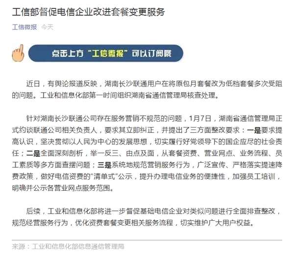 据媒体报道,有用户反映本人将湖南长沙联通原包月套餐改为低档套餐遭遇阻碍。对此,工信部官方微信“工信微报”发布通告。工信微报指出,针对湖南长沙联通公司存在服务营销不规范的问题,湖南省通信管理局本月正式约谈联通公司相关负责人,要求其立即纠正,并提出了三方面整改要求。