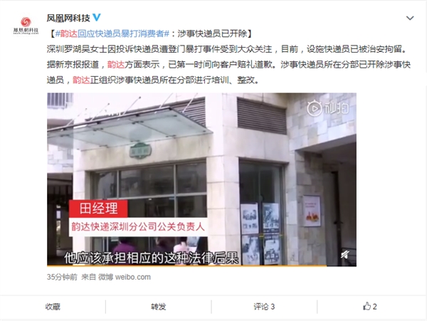 韵达快递深圳分公司公关负责人对媒体表示,从快递员来讲,动手打人本身就已经不对了,他应该承担相应的法律后果。我们要通过这个事情教育我们的业务员,利用好岁末年关的关键时期,处理好客户关系,同时维护好客户的权益。同时我们会积极跟伤者保持联系,力争把事情的负面影响降到最低。