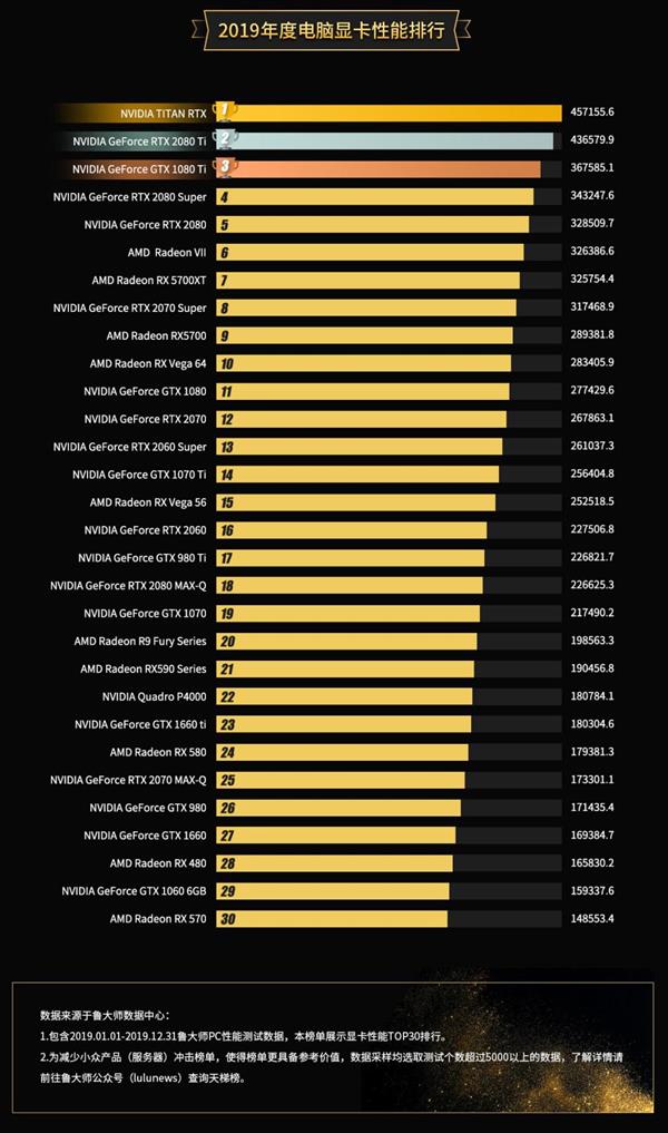 继处理器、内存、硬盘之后,今日鲁大师又发布了2019年度显卡性能排行。榜单显示,NVIDIA TITAN RTX顺利夺冠,且前五名都是N卡,A卡未进前五名。鲁大师表示,作为作为RTX 2080 Ti进阶版,NVIDIA TITAN RTX拥有同款TU102核心,每秒最多可计算110亿条光线,总晶体管数达到186亿个。此外,24GB GDDR6显存可满足8K分辨率下光线追踪的游戏大作,也是处理庞大的数据集、AI计算任务的最佳GPU,拿下最强显卡当之无愧。