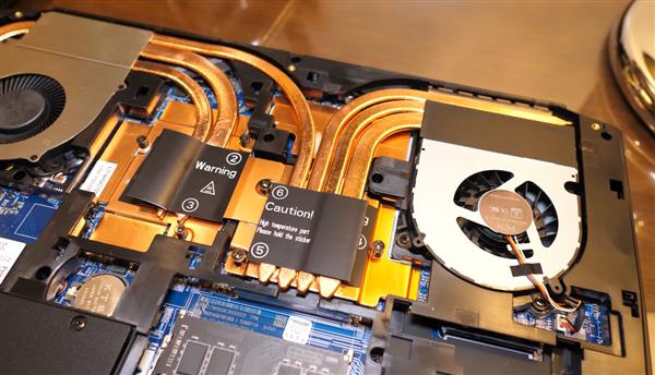 虽然65W听上去没比45W的H系列高多少,但实际使用是有很大不同的,笔记本处理器的频率限制比桌面更严,而为了控制这样65W处理器的发热,蓝天在散热上也下足了功夫,配备了2风扇6热管、大面积铜底等豪华散热。