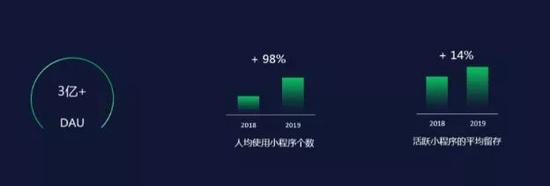 2017年1月,微信小程序正式上线,此后引领了一个群雄竞逐的风口。官方数据显示,截至2019年第三季度,微信小程序生态已拥有超过3亿日活跃用户。在2019年,活跃小程序的平均留存较2018年提升14%,小程序人均访问次数提升45%,人均使用小程序个数提升98%。