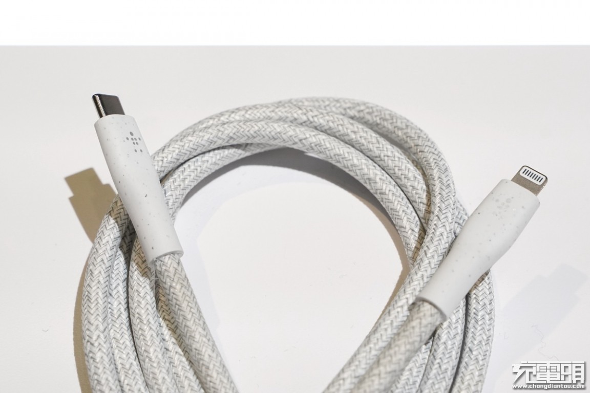 数据线为USB-C to Lightning数据线,可以为支持PD快充的phone手机提供快速充电。拉近视角,在端子头上面印制着belkin经典的标识,并且在端子头与数据线连接处均进行了加固设计,有效抗弯折拉扯。