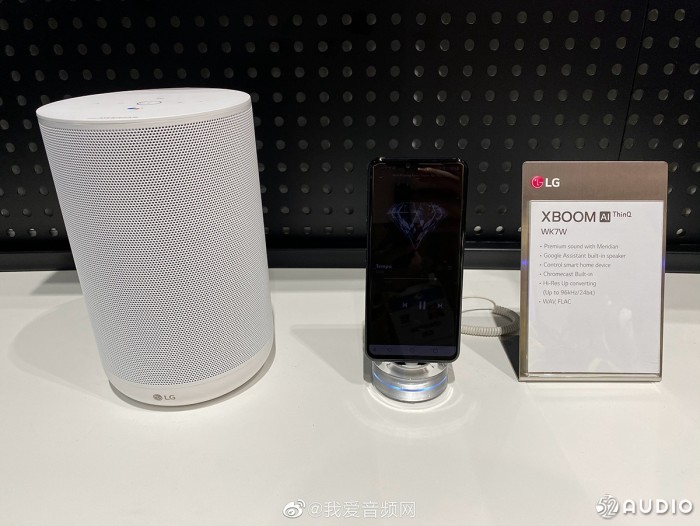 LG XBOOM ThinQ 智能音箱,圆筒形设计,顶部有按键。型号:WK7W,MERIDIAN音频支持,支持Google Assistant,支持智能家居互联,支持Google的Chromecast,Hi-Res认证,支持WAV和FLAC无损格式。