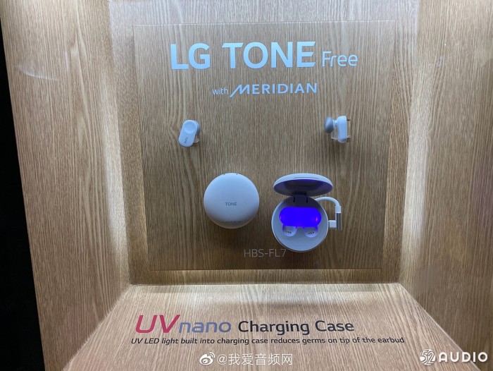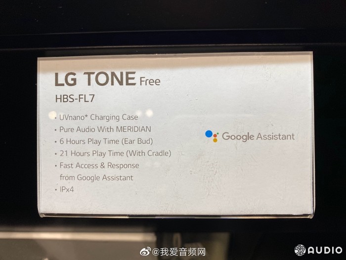 看看产品标签:LG TONE Free,型号HBS-FL7,采用UVnano技术的充电仓,MERIDIAN音频支持,耳机续航6小时,充电仓续航21小时,支持Google Assistant,IPX4级防水。