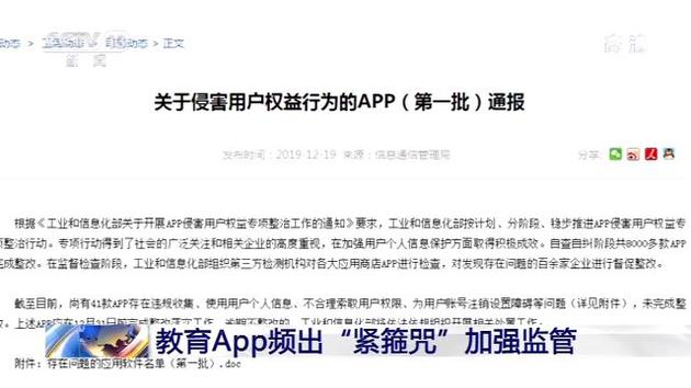 2019年12月19日,工信部通报了第一批侵害用户权益行为的App,41款App被要求整改,其中包括学霸君1对1、智学网、互动作业帮3款教育类App。教育部科技司司长雷朝滋表示,已和工信部、中央网信办进行沟通,对涉事的教育App的整改进行跟踪。未来,教育部也将建立教育App的常态化监管机制,在教育App的动态监管上进行制度建设。除了地方教育行政部门和相关部门加强监管,企业自身加强自我约束以外,教育部还将设置相关的举报渠道,对企业的发展,对教育App的健康发展进行促进。