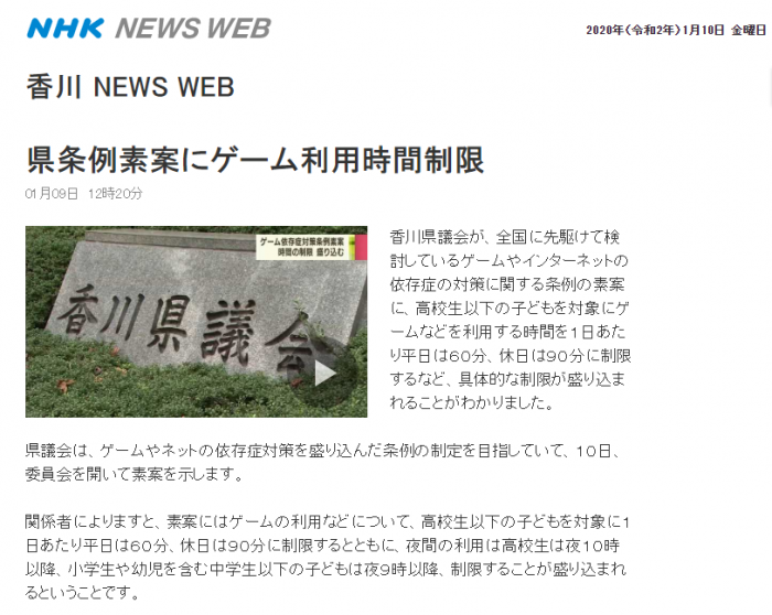 在2019年11月我们曾报道过,国家新闻出版广电总局发布了一则关于防止未成年人沉迷网游的通知,其中提到未成年人法定节假日每日累计不得超过3小时,其他时间每日累计不得超过1.5小时,一时间在网络引发热议。无独有偶,日本香川县近日也由议会起草了一份处理游戏和互联网以来的方案。