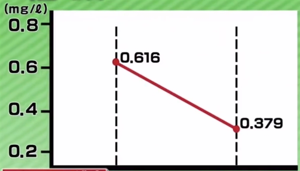 一周后,该男性贴上暖宝宝同样喝两合的日本酒。刚喝完时酒精浓度是0.820mg/L,然后过了30分钟后酒精浓度变成0.251mg/L,酒精浓度约为刚喝完时的四分之一。