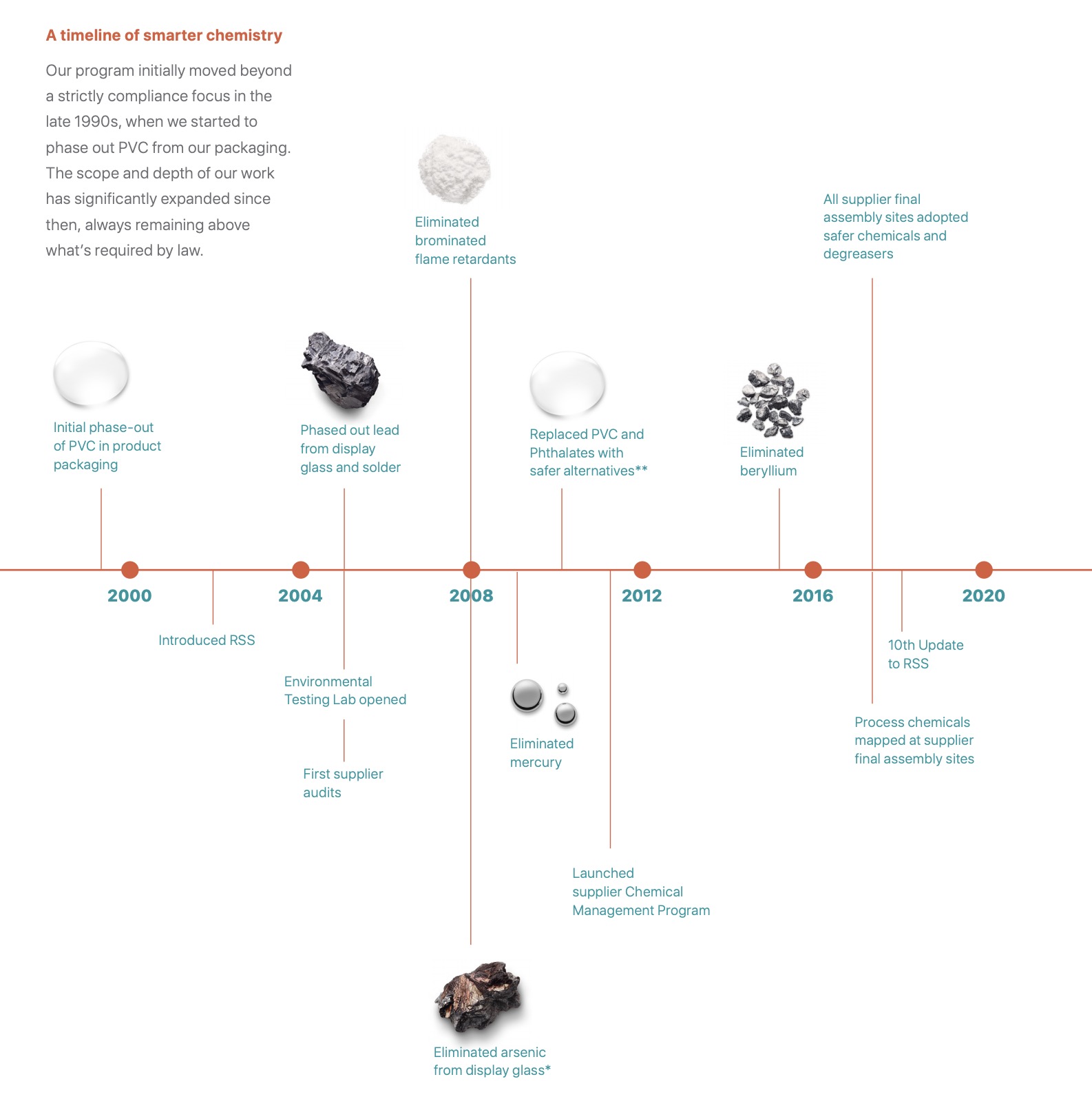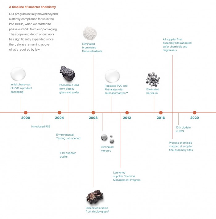 在化学品中,苹果在线缆材质中开始减少并且最后停用有害的PVC材质,同时使用对人体无害的清洁剂,在组装层面对人员进行保护。