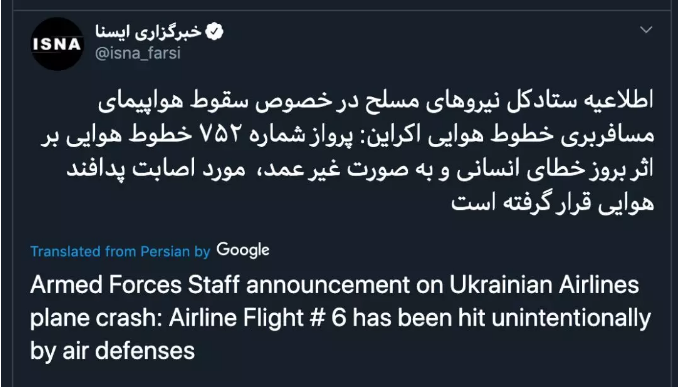 据美联社报道,伊朗国家电视台援引军方消息称,由于人为失误,伊朗“无意中”击落了乌克兰客机。伊朗外交部长扎里夫1月11日在推特上确认此事。他表示,“武装部队内部调查初步结论显示,美国冒险举动引发危机时的人为失误导致了这一灾难。我们向我们的人民、向遇难者家属以及其他受影响的国家表示深深的遗憾、歉意和哀悼。”