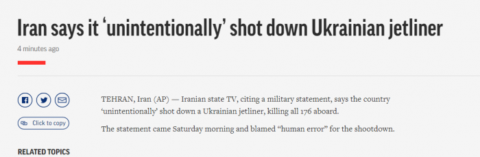 据美联社刚刚消息,伊朗国家电视台援引军方声明说,伊朗无意中击落了失事的乌克兰客机。声明于当地时间11日早上发布,并将飞机被击落归咎于“人为失误”。声明中表示,当时该航班离开伊玛目霍梅尼国际机场,靠近了伊斯兰革命卫队的一个敏感的军事中心。当时正值轮换,且该中心处于高级警戒状态。在此情况下,飞机被意外的人为错误击中。