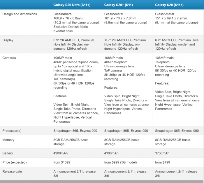 1月11日消息,Phone Arena整理了Galaxy S20系列的详细规格,该机将于2月11日正式发布。据悉,Galaxy S20系列包含Galaxy S20、Galaxy S20+和Galaxy S20 Ultra三款。