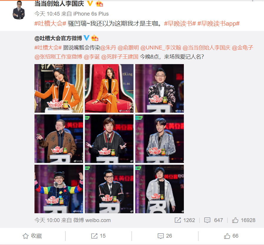 本期《吐槽大会》主咖为朱丹,嘉宾成员有当当网创始人李国庆(除了李国庆外,还有俞灏明、李汶翰、刘纯燕、张绍刚、李诞、王建国等)。