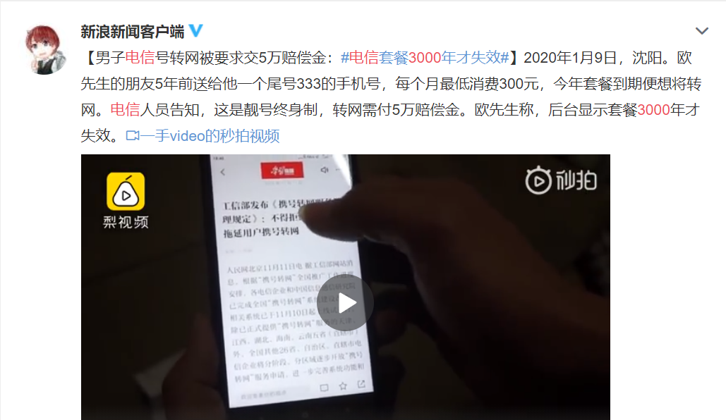 5年到期后,欧先生想办理携号转网,工作人员称要支付53000元赔偿金。欧先生被告知,这个手机号的实效时间是3000年,欧先生称到那时自己都不在了。