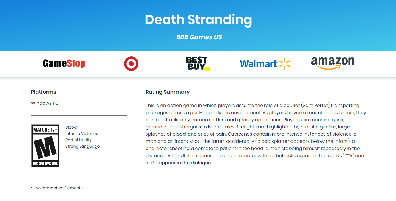 《死亡搁浅》是一个非常独特的游戏,从设定,音乐到几乎所有方面。目前这款游戏还会在今年夏季初时登陆PC平台发售。近日外媒发现北美娱乐软件协会ESRB已经完成了对《死亡搁浅》PC版的评级,和主机版一样都是M级(17禁)。这当然并不意味着什么,尽管通常来说一个游戏完成分级意味着这个游戏的宣传或发售日快到了。