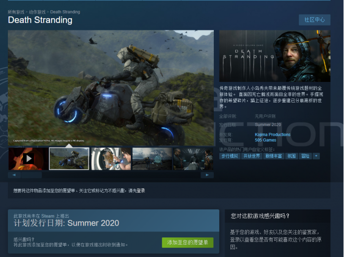 《死亡搁浅》PC版会同时登陆Steam和Epic游戏商城。Steam国区售价298元,支持简体中文。