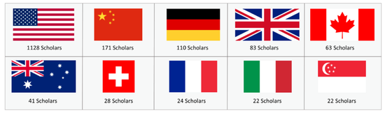 从国家角度看,美国学者人数的占比最高,有1128人,占比61.4%,超过总人数的一半,独自领跑第一梯队。中国排在美国之后,领跑第二梯队,有171人,占比9.3%。德国位列第三,是欧洲国家中拥有高影响力学者最多的地方;其余国家的学者人数量均少在100人以下。
