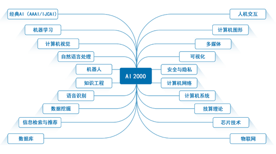 据了解,AI 2000涵盖人工智能学科20个子领域(经典 AI ( AAAI / IJCAI ) 、机器学习、计算机视觉、自然语言处理、机器人、知识工程、语音识别、数据挖掘、信息检索与推荐、数据库、人机交互、计算机图形、多媒体、可视化、安全与隐私、计算机网络、操作系统、计算理论、芯片技术、物联网)。