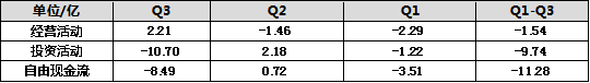 从自由现金流的角度看,公司现金流状况似乎不容乐观。截至Q3,公司的自由现金流净额-11.28亿,经营活动和投资活动均表现为现金流出,其中以投资活动流出为主,主要是Q3单季度投资活动净流出10.4亿,其中投资支付的现金为12亿。