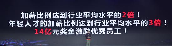 与此同时,他还宣布京东零售2020年的加薪资源还将持续高投入。加薪比例将达到行业平均水平的2倍,其中,年轻人才的加薪比例更将达到行业3倍。此外,还将投入14亿元奖金用于激励优秀员工。
