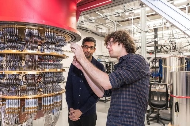 图示:去年在加州圣巴巴拉附近的一个实验室里,Alphabet首席执行官桑达尔·皮查伊(Sundar Pichai)和研究员丹尼尔·沙克(Daniel Sank)站在谷歌量子计算机旁。